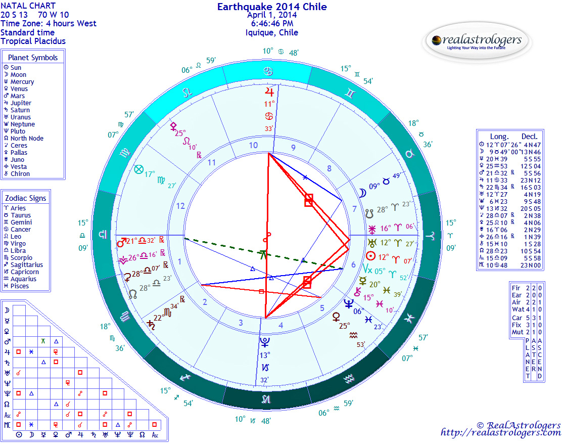 The chart for the earthquake off the coast of Chile has Jupiter dramatically positioned on the Midheaven opposite Pluto on the nadir, cusp of the fourth house. In mundane astrology, the fourth house rules the land itself.