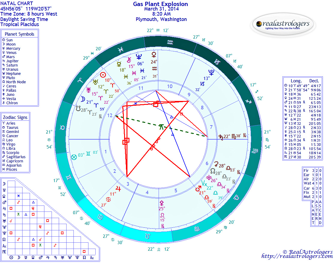 Among last week’s major events were the mega-earthquake in Chile and the shooting at Fort Hood, Texas. A third event, which didn’t get much coverage, was an explosion at a gas plant on the border between Washington and Oregon. I’m including this one, because the chart is very interesting and might provide still more clues about the timing of events related to the intense and very rare planetary configuration that has been building since last August.