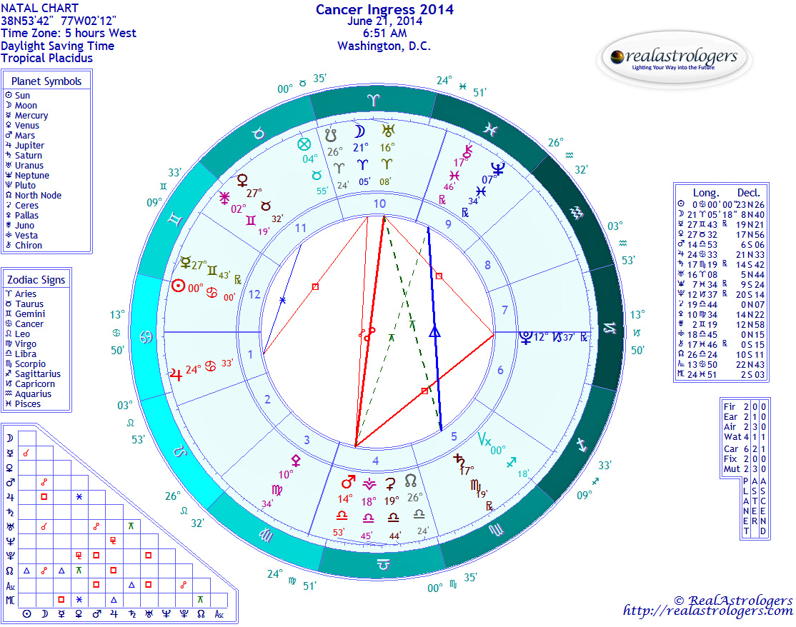 Because the Aries ingress chart for the United States has cardinal sign Cancer on the Ascendant, it is valid for only three months, and new ingress charts must be cast for each subsequent seasonal change. As I noted in my analysis, both the Aries and Cancer ingress charts for the United States have 13 degrees Cancer on the Ascendant, conjunct the U.S. Sun by exact degree. This suggests that summer is a continuation on a theme, but with a couple of important differences. That’s true for other countries, too, but the United States charts are particularly noteworthy. I wrote previously that there would be something fated or destined for the country, a landmark event. Potential candidates include the crisis in Iraq and possible cooperation between the United States and Iran. My gut instinct is that it does have something to do with the Middle East, and that Israeli involvement, although always a factor, will be more of a driving force. As I write, Israel has launched air strikes on Syria, which it says were in response to a cross-border attack in the Israeli-occupied Golan Heights.