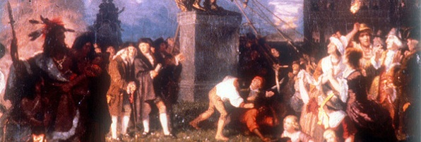 Artist Johannes A. S. Oertel, working in the mid-nineteenth century, provides an imagined depiction of the destruction of George III’s statue in Bowling Green, the first victim of New Yorkers’ reaction to hearing news of the Declaration of Independence. Oertel places women, children and Native Americans among what eyewitnesses recorded as a rowdy crowd of soldiers and civilians. No true image of the statue itself survives. However, contemporary descriptions inform us that the King was sculpted in Roman garb, not the eighteenth-century royal dress shown in the painting. More accurate is the view of the statue reconstructed by Charles M. Lefferts at right.