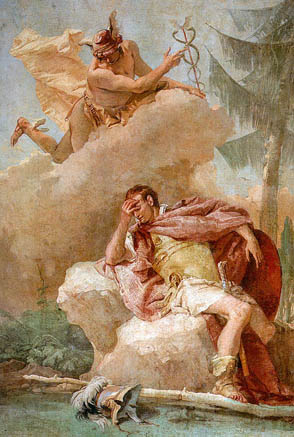 Mercury Appearing to Aeneas, by Giovanni Battista Tiepolo, 1757. In Virgil’s Aeneid, Jupiter sends Mercury to Trojan warrior Aeneas, who must choose between his destiny to found the city of Rome and his love for Queen Dido. The story recounts the mythological events of a changing era and the dawn of a new empire.