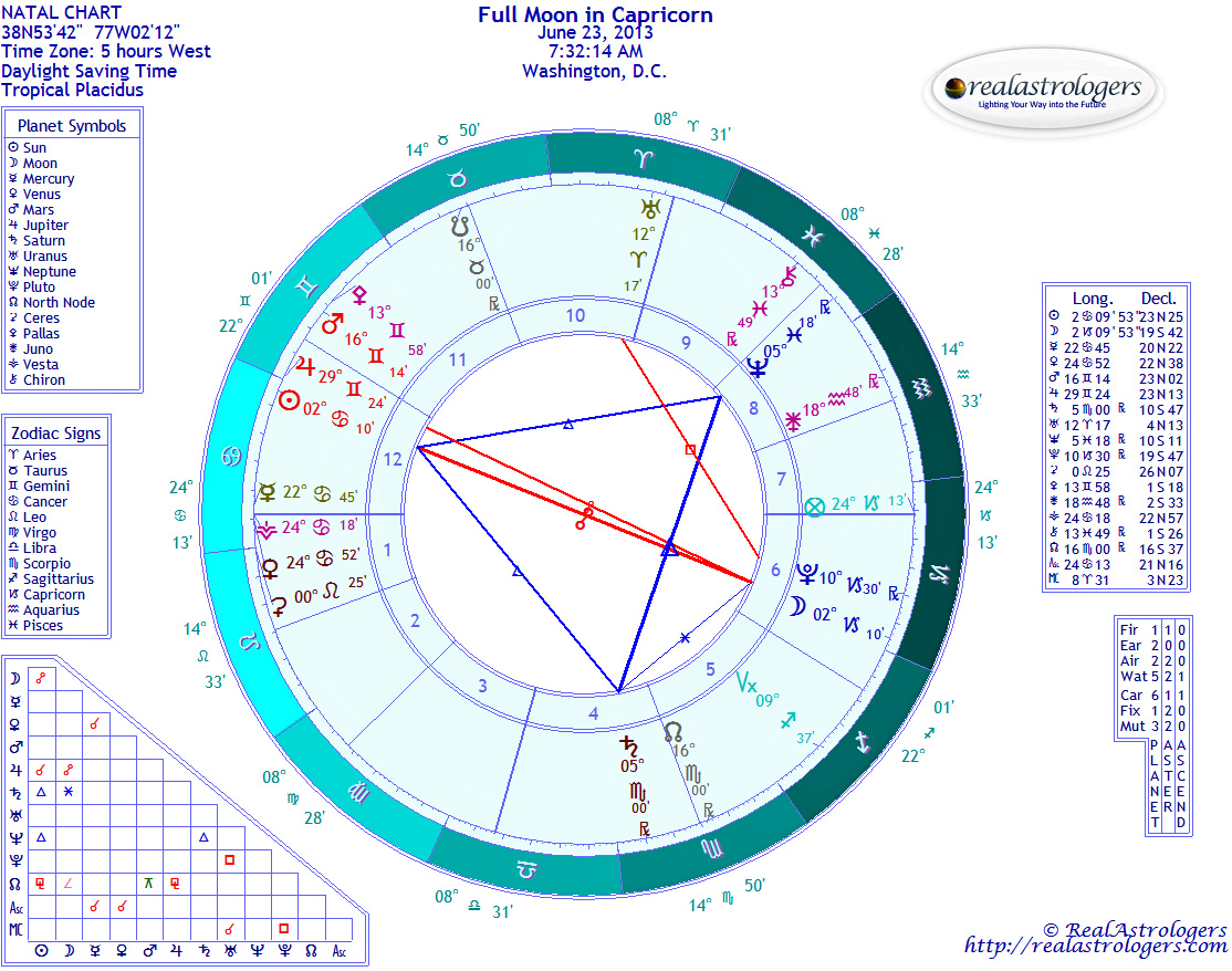 There is more I could write about the ingress, but let’s turn now to the Full Moon, which occurs on June 23. The Moon is in her detriment in Capricorn, but the Full Moon in Capricorn always falls with the Sun in Cancer, the sign the Moon rules. This gives us a week or so of inner angst and collective tension. The word “lunatic” derives from an old belief that people acted crazier at the Full Moon. With the Moon at her closet to the Earth and the motion of the Sun “stopped” as perceived from Earth, I’d say it’s a good bet there will be a lot of craziness. Add to that the connection to the 2010 cardinal T-square by degree, and we’ve got the makings of a perfect storm, be it symbolic or literal.